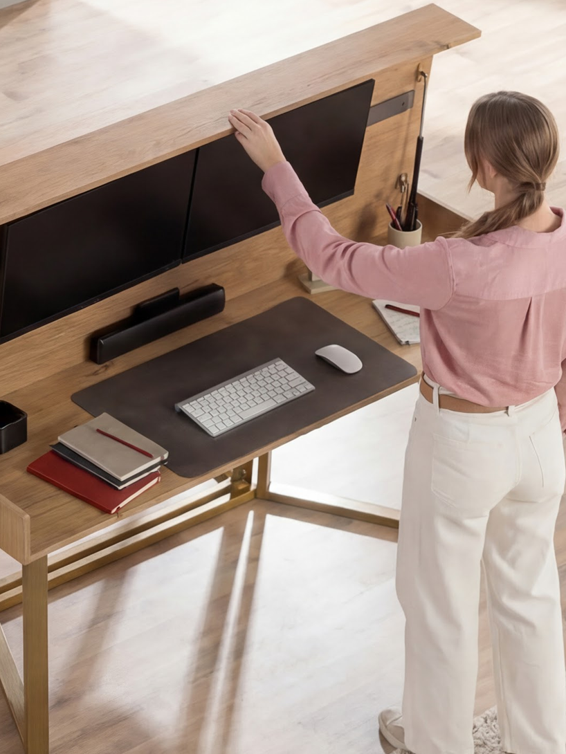 Seamlessly switch from 9-5 to 5-9, with the dining table that becomes two desks. Complete with integrated storage and cable management so work from home doesn't interfere with life at home.